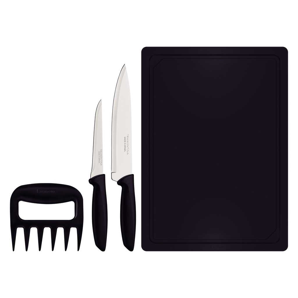 Juego de 2 Cuchillos, una garra y una tabla. Línea Plenus. Láminas en Acero Inoxidable. Mangos de Polipropileno Negro. Presentación: blister para colgar.