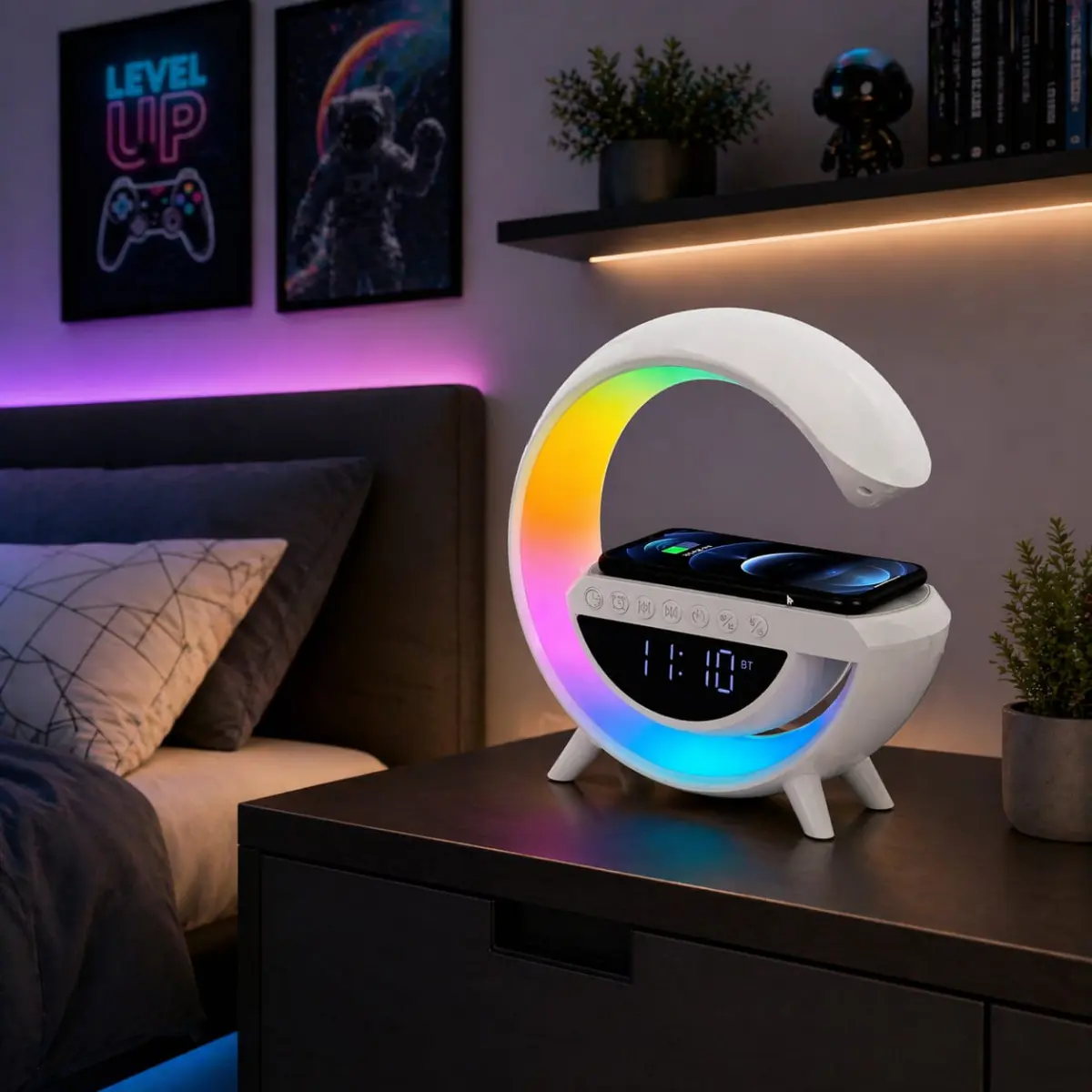 Un solo dispositivo, múltiples funciones. Iluminá, cargá tu celular, escuchá música y organizá tu día con este reloj lámpara moderno y práctico.